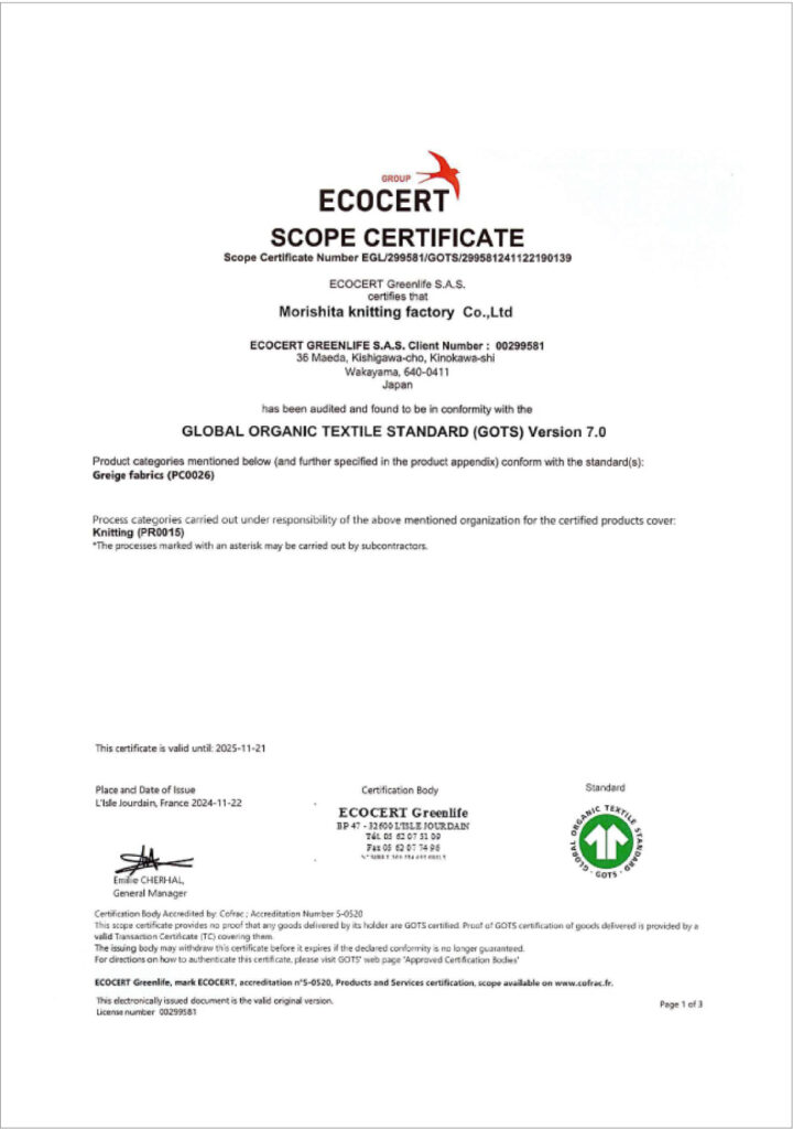 Morishita Knitting Factory has achieved GOTS certified in 2024.